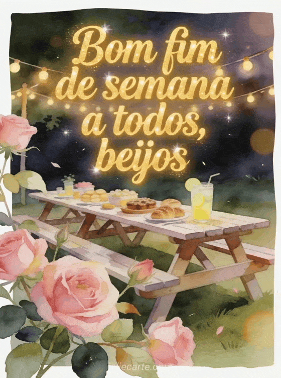 Compartilhe uma mensagem amiga de fim de semana com rosas, uma longa mesa de piquenique, doces, limonada e luzes de fada. Você também pode enviar muitos beijos e bom fim de semana, um bom fim de semana muitos beijos gif ou feliz sexta-feira bom fim de semana beijos.