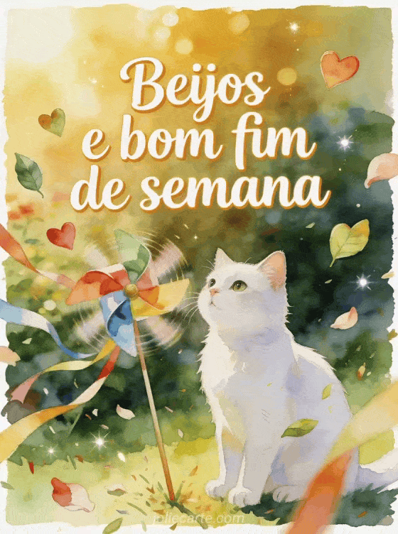 Compartilhe uma mensagem divertida de fim de semana com um gato branco ao lado de um cata-vento girando, folhas em forma de coração e um jardim ensolarado em aquarela. Você também pode enviar bom fim de semana beijos grandes, bom fim de semana com beijos ou beijinhos de fim de semana.