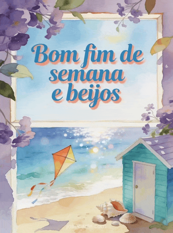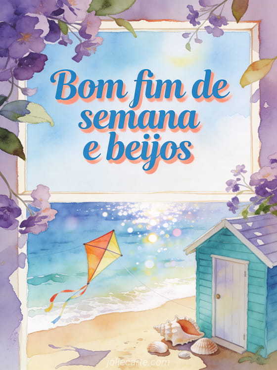 Deseje bom fim de semana e envie beijos com uma cabana de praia turquesa, conchas, uma pipa brilhante e violetas à beira-mar ensolarada. Veja também bom fim de semana muitos beijos, beijos fim de semana ou beijos de fim de semana.