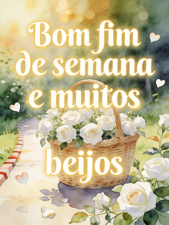 Envie um cartão terno com rosas brancas ao redor de uma cesta de vime numa trilha ensolarada e pétalas em forma de coração. Descubra também um beijos e bom fim de semana, um beijos bom fim de semana imagem ou beijos último fim de semana do ano.