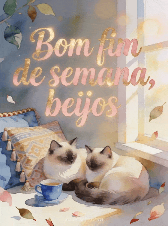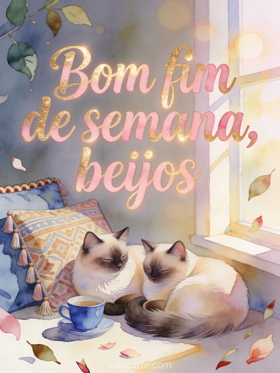 Envie uma saudação acolhedora de bom fim de semana com dois gatos birmaneses, uma xícara azul e charme de aquarela. Veja também um imagens de beijos bom fim de semana, um bom fim de semana primavera ou um gif beijos bom fim de semana.