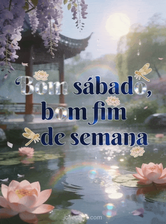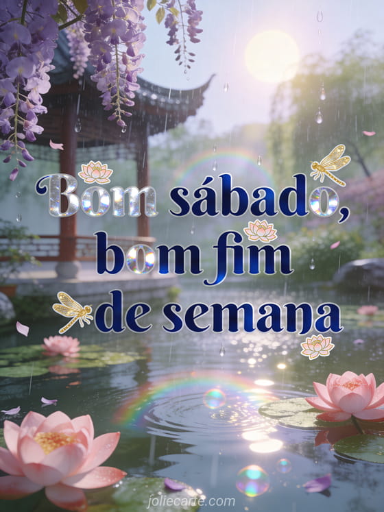 Compartilhe um bom sábado e fim de semana tranquilo com um pavilhão em jardim asiático, glicínia roxa, lótus rosas e libélulas douradas sob chuva de verão. Veja também feliz sábado e bom fim de semana, uma feliz sábado imagem ou feliz sábado imagens.