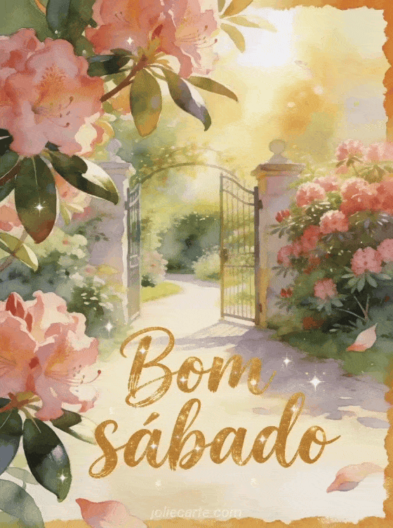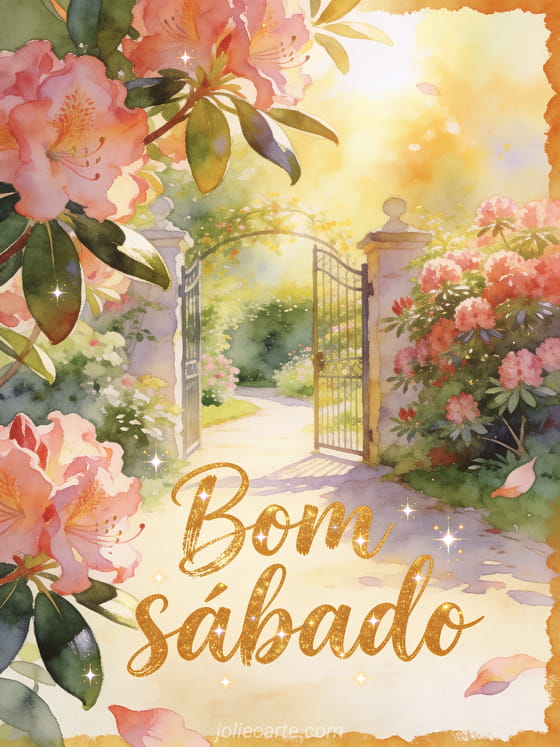 Compartilhe um bom sábado alegre com letras douradas, um portão de jardim iluminado pelo sol e rododendros abundantes. Este cartão grátis traz brilhos, folhas reluzentes e um caminho suave para começar o fim de semana com cor. Veja também um feliz sábado muitos beijos gif, uma imagem grátis bom dia sábado ou belas imagens de feliz sábado.