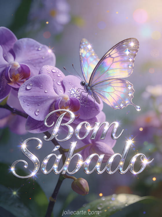 Compartilhe um mágico Bom sábado com este cartão grátis que mostra uma borboleta cintilante sobre uma orquídea roxa em um jardim de sonho. Você também pode descobrir bom sábado bom dia, bom sábado belas imagens bom fim de semana ou cartão bom sábado grátis.