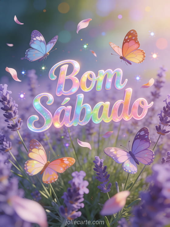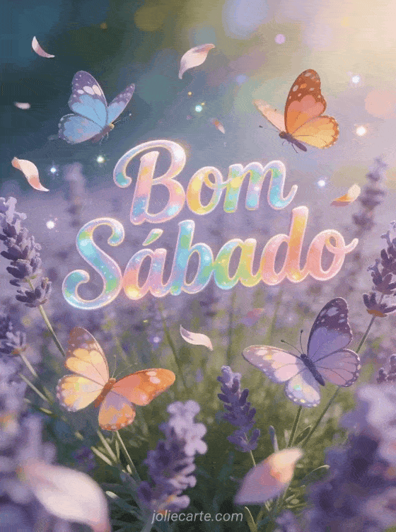 Compartilhe um alegre desejo de bom sábado com este gif animado com alegres borboletas dançando em campos de lavanda com uma suave brisa. Descubra também fotos bom sábado ou feliz sábado chuvoso para mais inspiração de sábado.