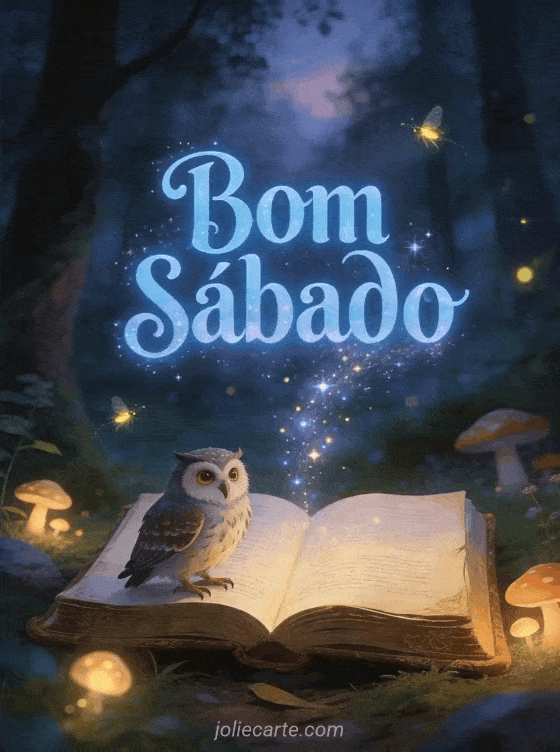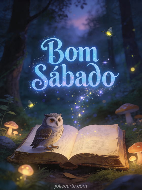 Compartilhe um mágico Bom sábado com este cartão grátis que mostra uma sábia coruja pousada sobre um livro antigo em uma floresta ao entardecer com cogumelos brilhantes. Você também pode descobrir bom sábado imagem engraçada, boa noite de sábado ou bom sábado amigos.