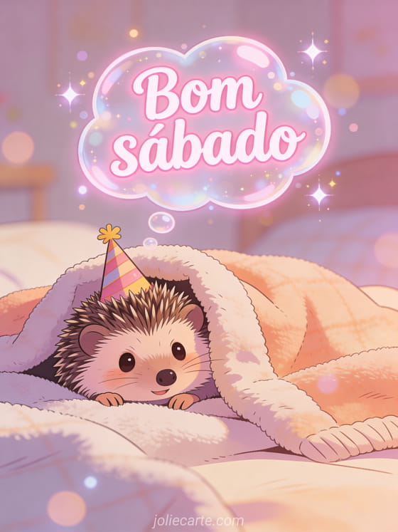 Compartilhe um hilariante cartão de bom sábado com humor com um adorável ouriço com chapéu de festa espiando de uma pilha de cobertores aconchegantes. O cartão perfeito para a manhã preguiçosa de fim de semana. Descubra também um cartão feliz sábado paisagem ou um cartão imagens feliz sábado.