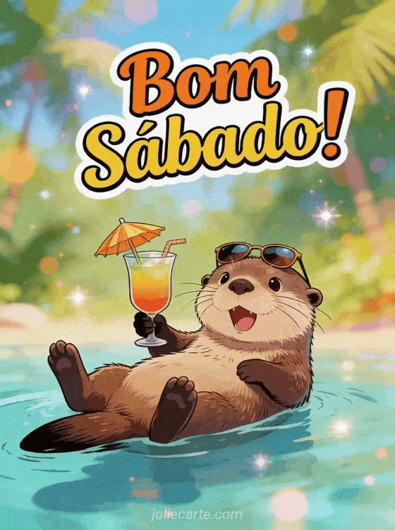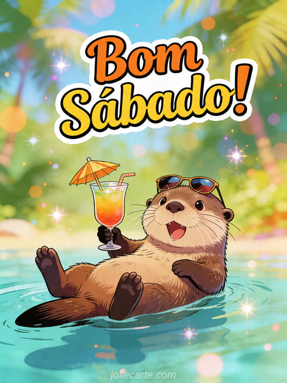 Arranque risadas com este cartão de sábado mostrando uma lontra muito engraçada boiando de costas com óculos minúsculos e um coquetel em clima tropical. Você também pode ver boa noite de sábado, bom sábado amigos ou engraçado bom sábado humorístico.