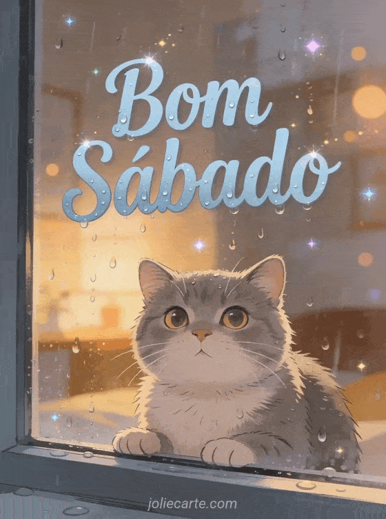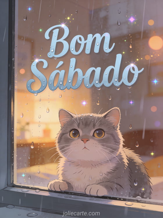 Compartilhe uma aconchegante saudação de sábado com esse adorável cartão com um gato british shorthair olhando a chuva. Descubra também um cartão bom dia sábado citação ou um cartão lindo bom sábado.