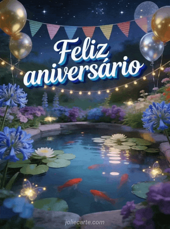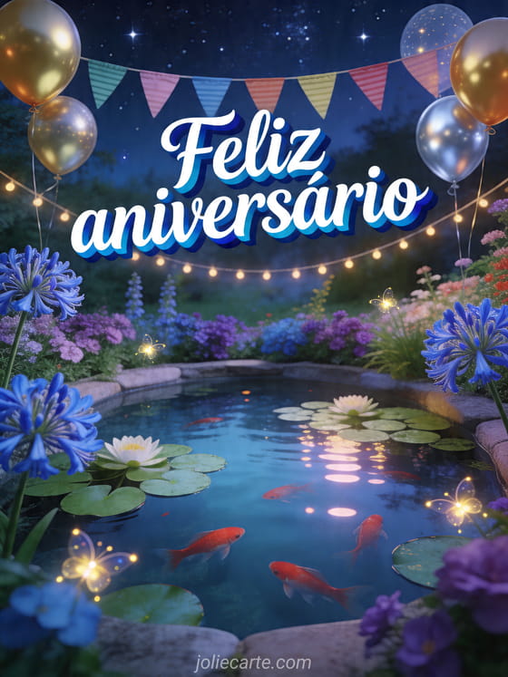 Compartilhe um feliz aniversário acolhedor com este cartão festivo que mostra um lago com peixes dourados, nenúfares, agapantos, balões e reflexos brilhantes sob um céu estrelado. Você também pode ver desejar feliz aniversário à distância, palavras para desejar feliz aniversário ou feliz aniversário carro.