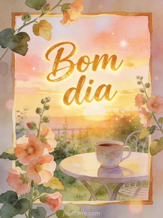 Comece o dia com um cartão em aquarela cheio de luz dourada, malvas-rosas e uma xícara de café sobre uma mesa de jardim. Você também pode enviar bom dia meu querido café, manhã café café manhã bom dia ou uma imagem de bom dia bom café.