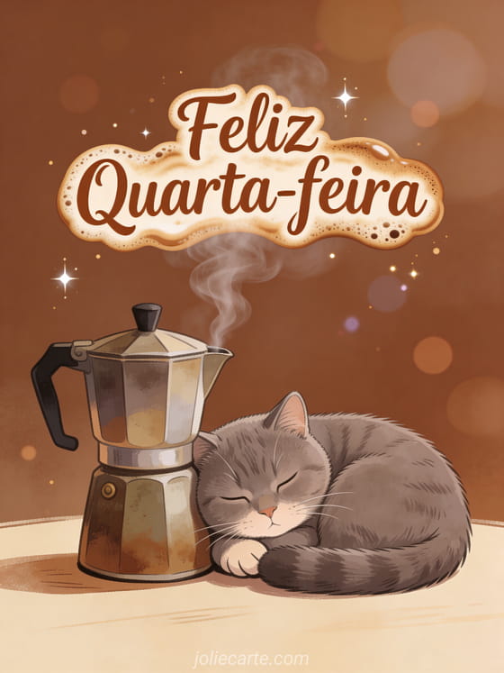 Comece a quarta-feira com uma xícara de café quentinho e a vibe de um gatinho sonolento. Compartilhe este reconfortante cartão matinal com alguém que precisa de uma feliz quarta-feira. Descubra também uma foto quarta ensolarada ou uma imagens feliz quarta na chuva.
