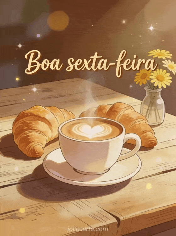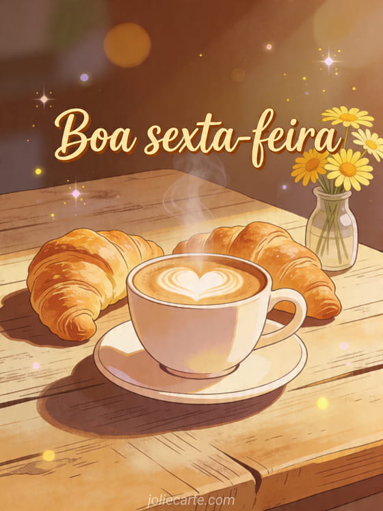 Comece a sexta-feira com charme usando este cartão acolhedor com cappuccino fumegante, croissants dourados e margaridas amarelas sobre uma mesa rústica de café da manhã. Você também pode ver bom dia boa sexta-feira ótimo dia, boa sexta-feira gato ou bom dia é sexta-feira gif.