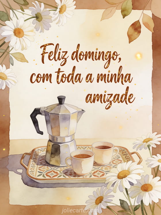 Compartilhe um feliz domingo amigável com uma cafeteira moka, duas xícaras pequenas, uma bandeja de café da manhã estampada e margaridas em luz quente de aquarela. Você também pode compartilhar bom domingo belas imagens animadas, cartões bonitos feliz domingo ou imagem para desejar feliz domingo.