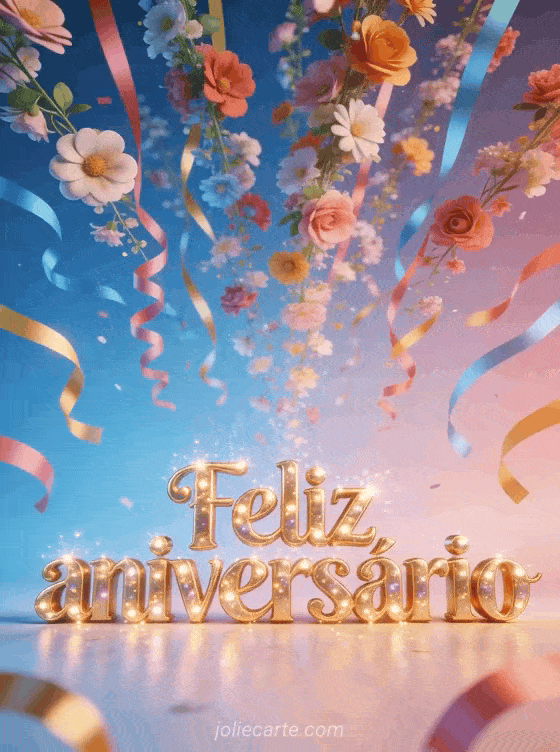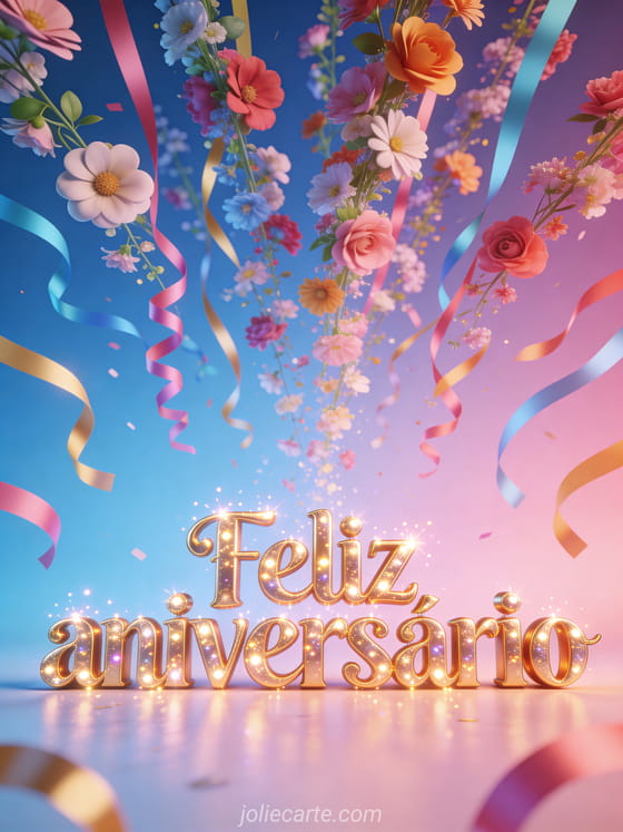 Envie este alegre cartão animado de aniversário com letras douradas brilhantes e uma cascata de flores e fitas coloridas caindo do céu em estilo 3D festivo. Um cartão gratuito para o dia especial dela. Descubra também cartão de aniversário elegante para mulher ou mensagem para aniversário de mulher.