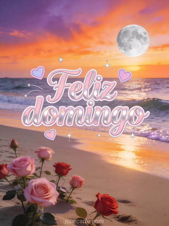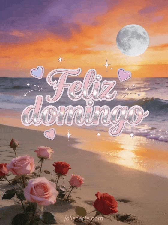 Envie um cartão animado de feliz domingo com letras em script rosa empoeirado, reflexos prateados, corações em tons pastel e estrelas cadentes sobre uma praia ao pôr do sol. Compartilhe um desejo romântico de domingo e veja também bom domingo humor gif animado, bom dia bom domingo imagem ou feliz domingo e bom dia.