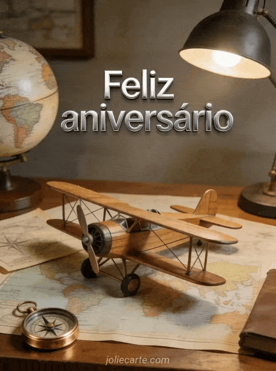 Compartilhe um caloroso feliz aniversário com este cartão fotorrealista com um avião vintage de madeira, mapas antigos, uma bússola de cobre e um globo sobre uma escrivaninha. Você também pode ver animado feliz aniversário menino gif, cartão aniversário animado 1 ano ou cartões animados de aniversário jolie carte.