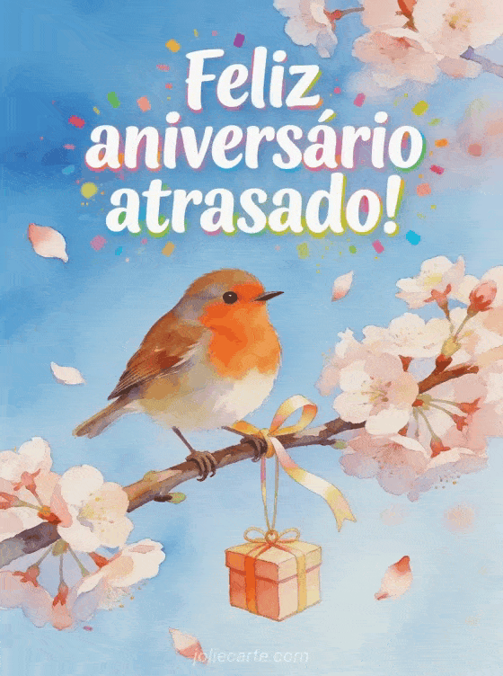 Envie um delicado feliz aniversário atrasado com este lindo cartão com um pintarroxo, flores de cerejeira e um presente. Descubra também um cartão de aniversário atrasado com gatinho ou um cartão de aniversário atrasado com humor.