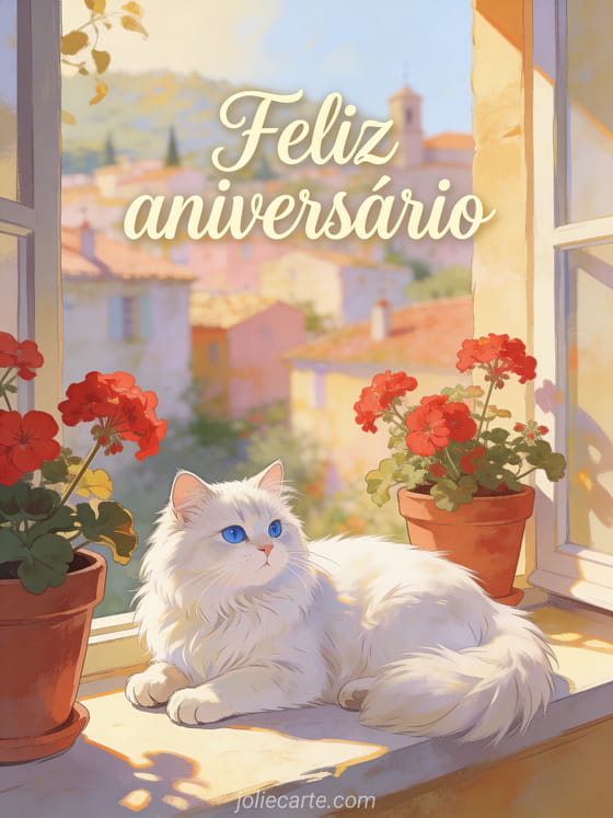 Envie este delicioso cartão animado de aniversário com um lindo gato persa branco de olhos azuis num peitoril ensolarado com vasos de flores e gerânios vermelhos, diante de uma aldeia provençal desfocada. Um cartão gratuito com charme mediterrâneo. Descubra também gif animado de aniversário ou cartão de aniversário animado grátis.