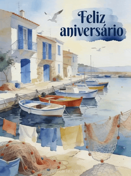 Surpreenda-o com este impressionante cartão animado com um pitoresco porto em aquarela. Descubra também um cartão feliz aniversário homem grátis ou um gif feliz aniversário homem.