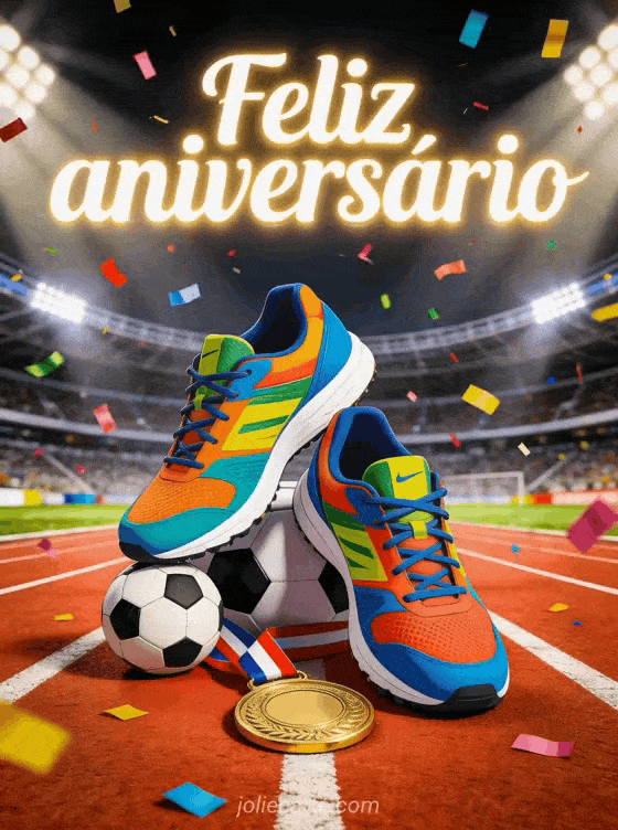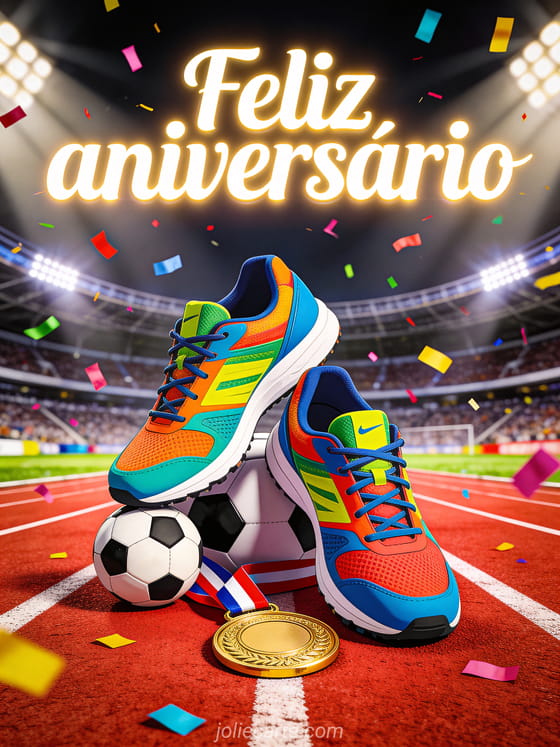 Comemore com este cartão aniversário homem esportivo com tênis de corrida coloridos na pista de atletismo, bola, medalha dourada e confete sob luz dramática de estádio. Você também pode ver feliz aniversário homem moto, cartão aniversário homem amor e texto aniversário homem amigo.