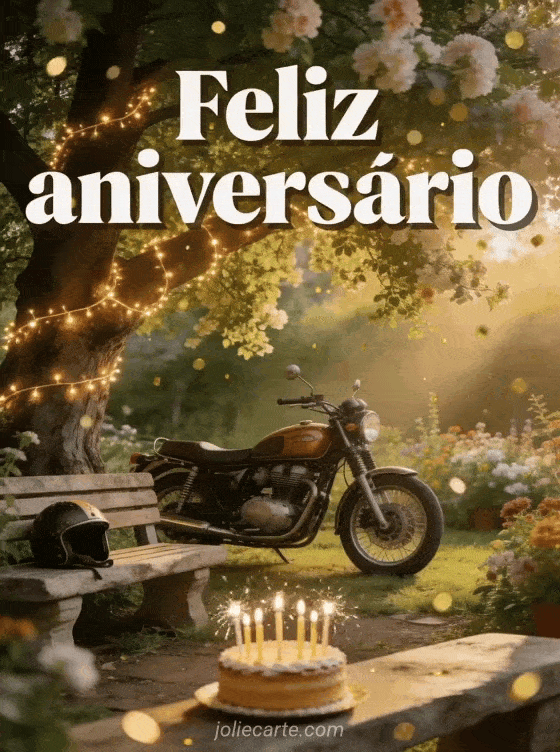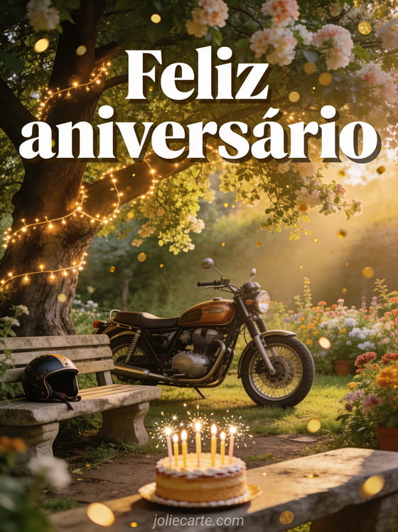 Compartilhe este encantador cartão de aniversário para o amante de motos, com uma moto vintage num jardim florido. Descubra também um imagens animadas feliz aniversário homem ou um gif feliz aniversário homem engraçado.