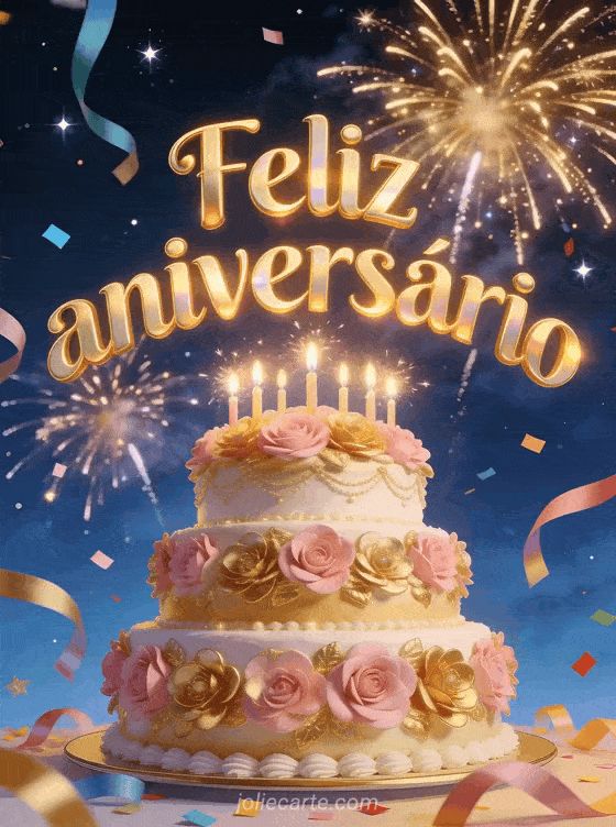 Envie este grandioso cartão de aniversário com um elegante bolo de três andares decorado com flores de açúcar rosas e douradas com velas cintilantes e fogos de artifício dourados estourando em um céu azul noite. Descubra também um cartão de aniversário com superfloração ou um cartão de aniversário romântico para amigo.
