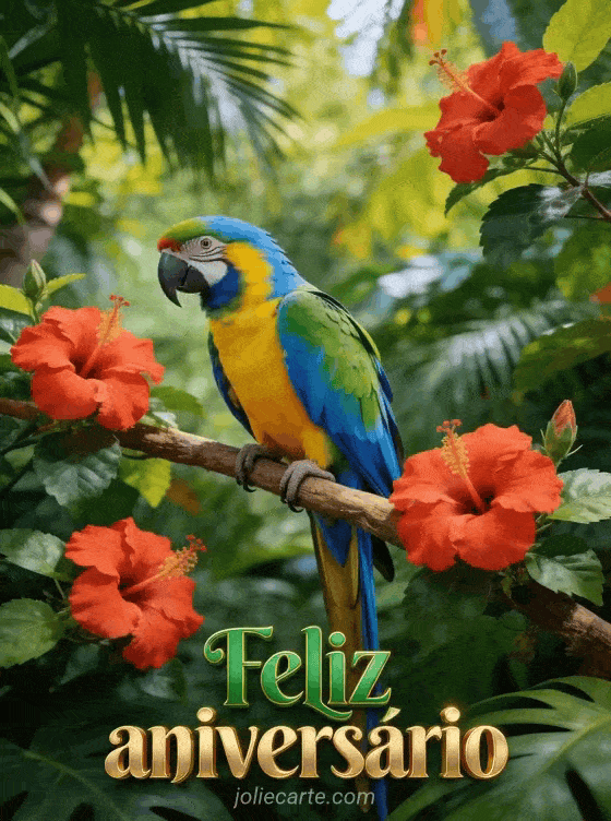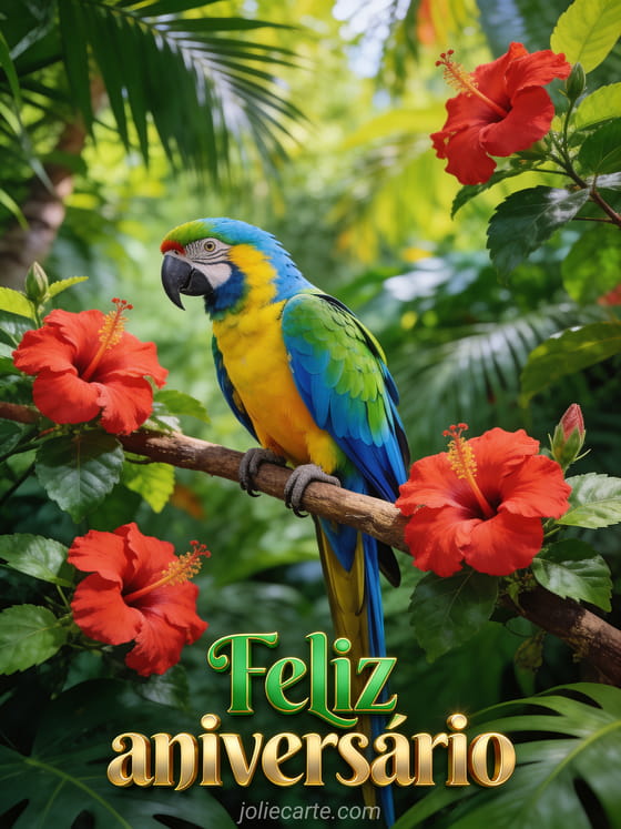Envie um cartão de aniversário vibrante com um papagaio arara multicolorido pousado em um galho tropical com flores de hibisco. Descubra também palavras de aniversário para mulher ou uma mensagem de feliz aniversário para mulher.