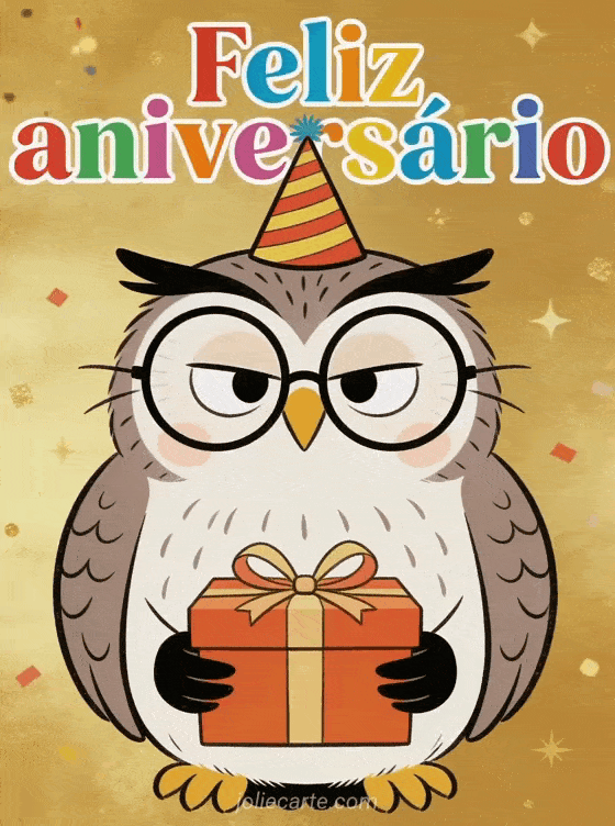 Envie um cartão de aniversário engraçado com uma coruja com grandes óculos redondos e um chapéu de festa segurando um presente. Descubra também uma mensagem para aniversário de mulher ou um cartão aniversário mulher elegante.