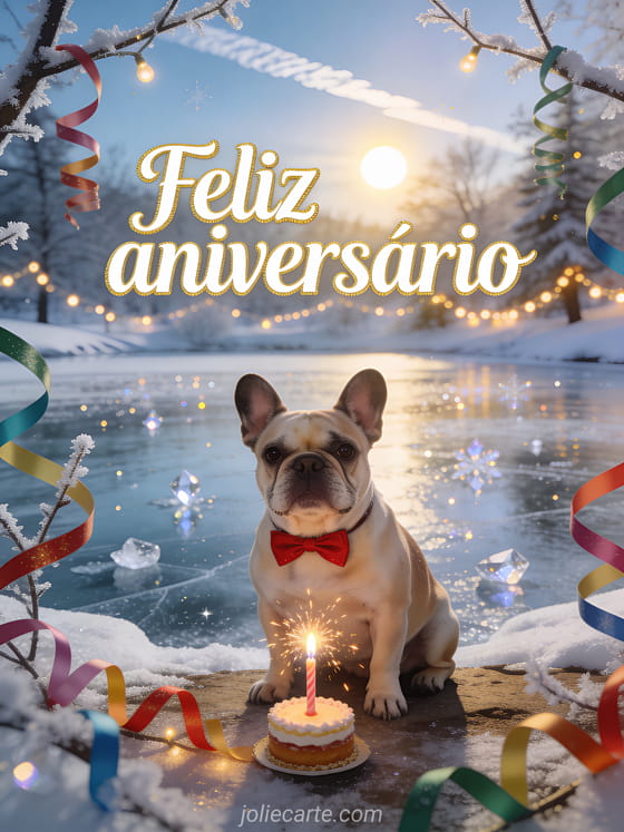Envie este cartão de aniversário para mulher com cachorro — um adorável buldogue francês com gravata borboleta vermelha sentado junto a um lago congelado cintilante, com serpentinas coloridas e faíscas. Descubra também feliz aniversário linda mulher ou imagens engraçadas de aniversário para mulher.