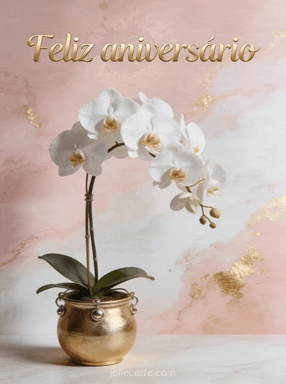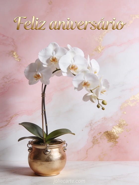 Envie este sofisticado cartão de aniversário com uma orquídea branca em um vaso de cerâmica dourada sobre fundo marmoreado rosa e branco com detalhes dourados. Um cartão gratuito perfeito para ela. Descubra também cartão de aniversário com desenho para mulher ou feliz aniversário para amiga.