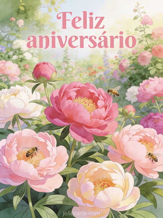 Ilumine o dia especial dela com este lindo cartão de aniversário com um jardim de peônias exuberantes em plena floração, do rosa pálido ao fúcsia, com abelhas entre as flores. Uma luz suave de primavera torna este cartão verdadeiramente mágico. Descubra também uma imagem feliz aniversário mulher ou uma gif feliz aniversário mulher.
