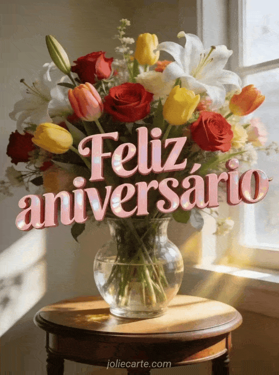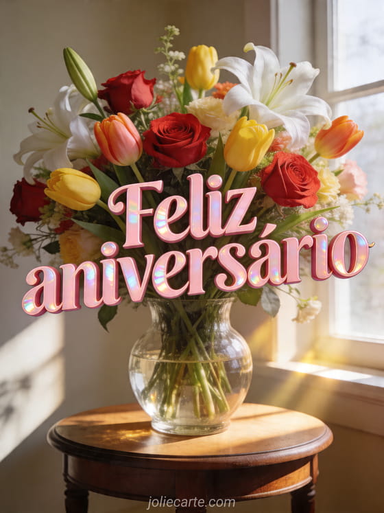 Compartilhe um delicado feliz aniversário com este cartão fotorrealista com um grande buquê de flores variadas em um vaso de vidro iluminado pelo sol da janela. Você também pode ver gif grátis aniversário mulher humor, foto aniversário mulher ou aniversário mulher humorístico.