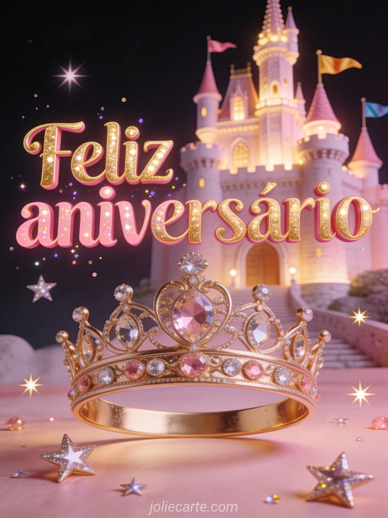 Envie este cartão de aniversário de princesa animado com letras rosa e douradas, um castelo de conto de fadas e uma coroa com pedras preciosas. Descubra também um gif animado de feliz aniversário ou um cartão animado de feliz aniversário grátis.