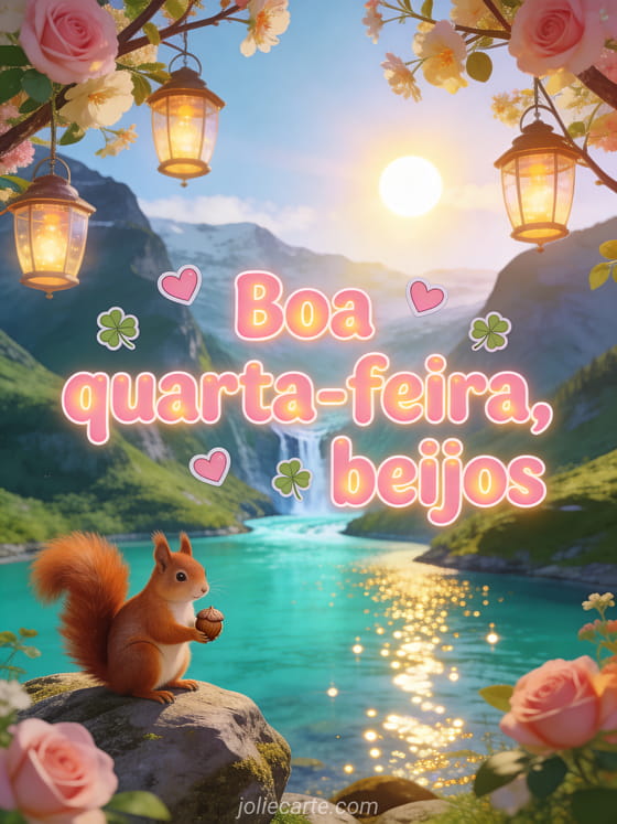 Envie beijos de boa quarta-feira com um fiorde turquesa, montanhas verdes, lanternas luminosas e um esquilo vermelho segurando uma avelã. Veja também um texto para desejar uma feliz quarta-feira, feliz quarta-feira com animais ou uma imagem animada feliz quarta-feira.