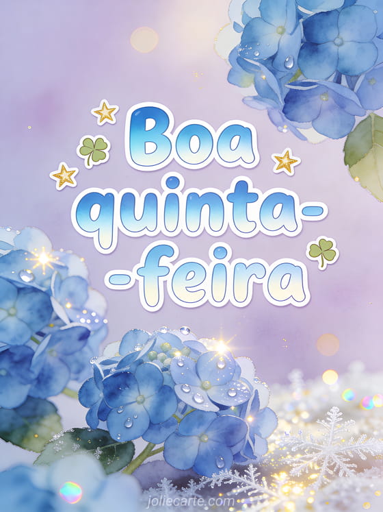 Envie uma boa quinta-feira delicada com hortênsias azuis, orvalho brilhante, geada fina e um fundo pastel lavanda. Veja também uma desejar uma feliz quinta-feira em imagem, bom dia quinta-feira ou feliz quinta-feira gato.