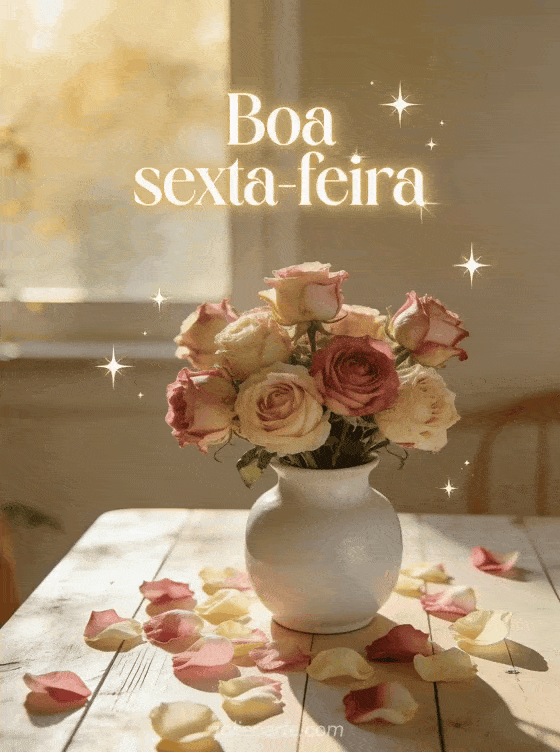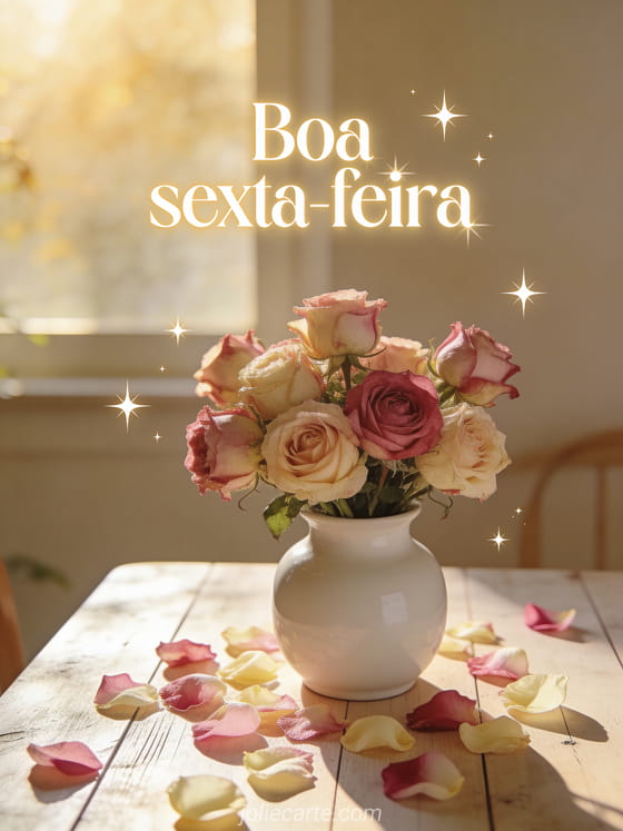 Envie uma boa sexta-feira delicada com um buquê de rosas antigas em um vaso de cerâmica branca, luz suave da manhã e detalhes brilhantes refinados. Veja também feliz sexta-feira engraçado humor gif, feliz sexta-feira beijos gifs animados ou uma frase de bom dia sexta-feira.