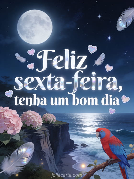 Envie um cartão bom dia sexta-feira com letras brancas elegantes, reflexos prateados, corações em tons pastel e uma falésia costeira ao luar sobre o oceano. Compartilhe um desejo poético para o fim da semana e veja também citação zen feliz sexta-feira, feliz sexta-feira e bom fim de semana ou imagem de feliz sexta-feira beijos.