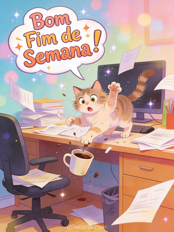 Envie um cartão de bom fim de semana com humor e faça alguém gargalhar. Um gato assustado derrubando acidentalmente uma xícara de café com papéis voando por toda parte é a comédia perfeita para um bom fim de semana. Descubra também um cartão bom fim de semana gato ou um bom fim de semana a todos humor.