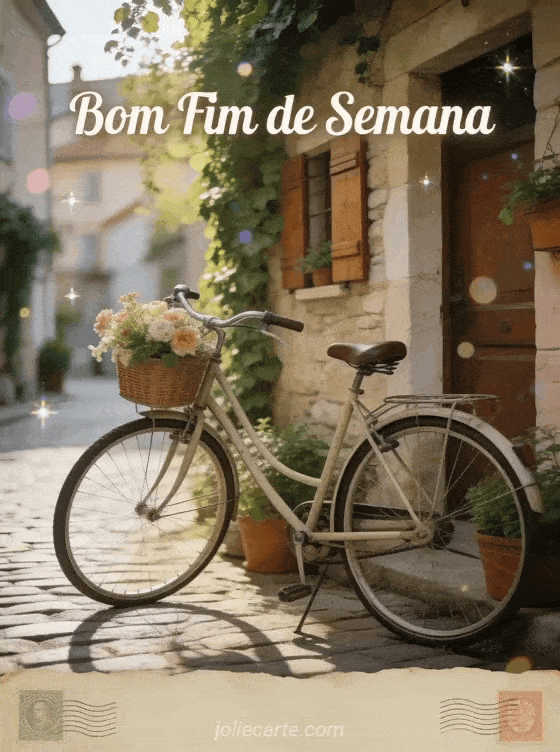 Deseje um bom fim de semana com este encantador postal vintage que apresenta uma bicicleta antiga com cesta de flores em uma rua de paralelepípedos de um vilarejo europeu com paredes cobertas de hera. Descubra também um bom fim de semana ensolarado ou um bom fim de semana humor.