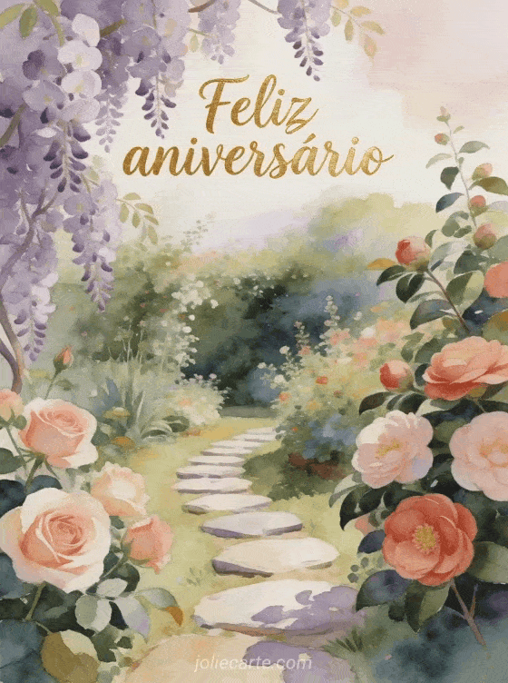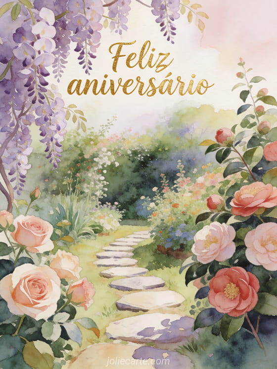 Envie um delicado cartão de aniversário em aquarela com um jardim florido exuberante com glicínias, rosas e camélias ao longo de um caminho de pedra. Descubra também aniversário mulher humor ou fotos aniversário mulher.