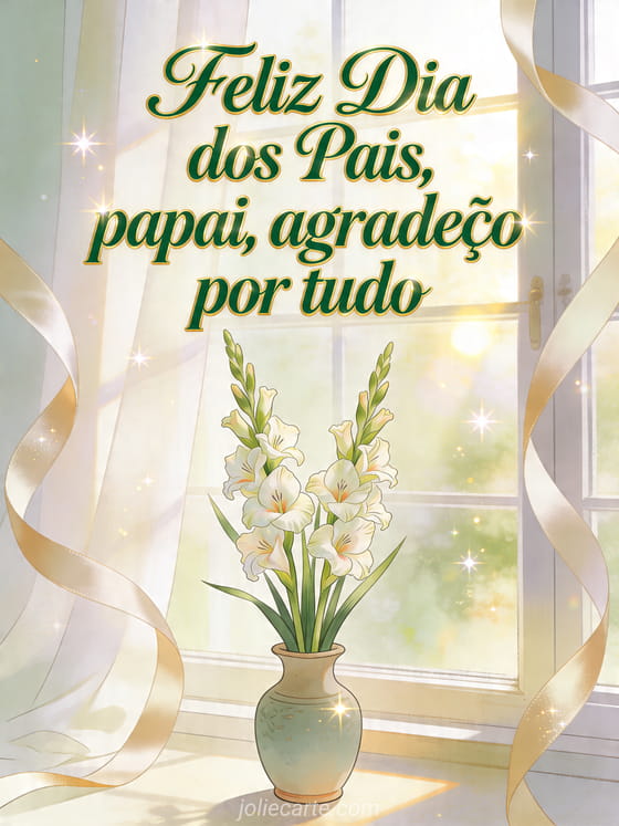 Envie um cartão bonito de Dia dos Pais com caligrafia verde-floresta refinada, borda dourada e uma ilustração botânica delicada de gladíolos altos em um vaso de cerâmica perto de uma janela ensolarada com fitas de cetim. Você também pode descobrir feliz dia dos pais para todos os papais, Dia dos Pais sinto sua falta ou um cartão com feliz Dia dos Pais.