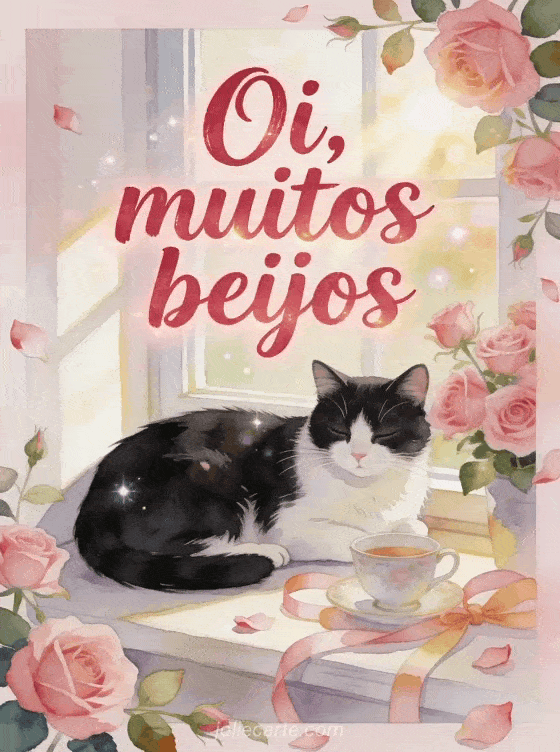 Compartilhe um oi caloroso com letras vermelho-rosadas em aquarela, um gato preto e branco perto de uma janela luminosa, rosas rosadas, uma xícara de porcelana, fitas e raios de sol. Veja também um cartão de oi vida, um cartão de oi coelhinho ou um cartão de mensagem um oizinho beijos.