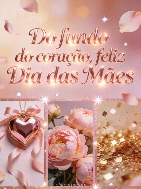 Compartilhe um cartão com coração Dia das Mães com um enfeite polido, peônias rosadas, fitas de seda e confetes dourados. Veja também um poema de amor para o Dia das Mães, feliz Dia das Mães ou feliz Dia das Mães mamãe querida.