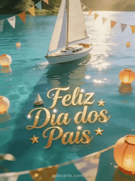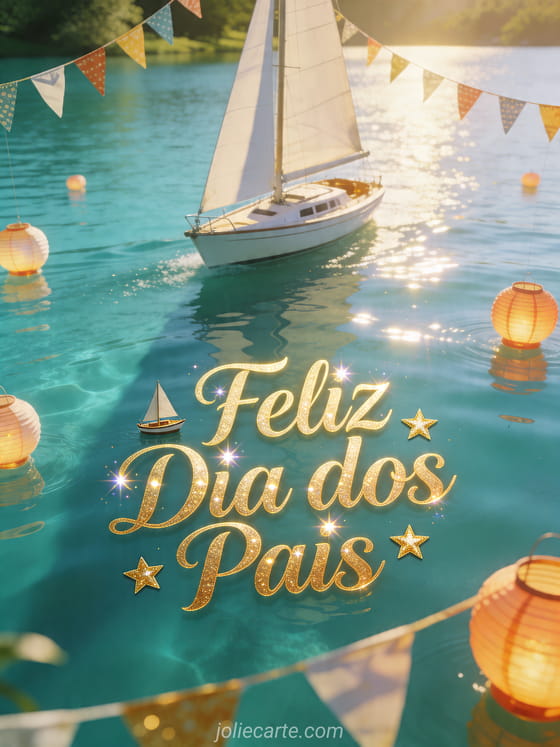 Envie um cartão com feliz Dia dos Pais com escrita dourada elegante, adesivos de pequenos veleiros e estrelas douradas, um veleiro branco deslizando em um lago turquesa perto de bandeirinhas festivas e lanternas flutuantes sob luz brilhante de verão. Veja também um modelo de cartão para Dia dos Pais, uma imagem do Dia dos Pais ou uma foto dia dos pais.