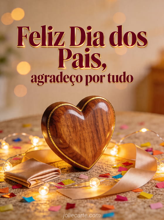 Envie um cartão coração de Dia dos Pais com letras rubi intenso, destaque dourado quente e uma escultura de coração em madeira polida cercada por pequenas luzes, fita dobrada e confete brilhante sobre uma mesa texturizada. Você também pode descobrir feliz dia papai e mamãe, feliz dia dos pais ao meu filho ou uma imagem grátis Dia dos Pais.