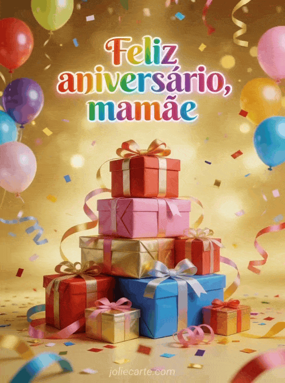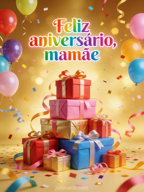 Celebre a mamãe com um cartão de aniversário colorido cheio de texto arco-íris, presentes empilhados, fitas, laços, confete, serpentinas, balões e um clima dourado luminoso. Você também pode enviar um cartão de feliz aniversário minha mãezinha, um cartão de feliz aniversário mamãe desenho ou um cartão de mensagem curta de aniversário para mamãe.