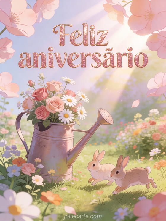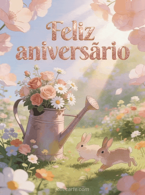 Envie este encantador cartão animado de aniversário com dois adoráveis coelhinhos brincando entre rosas e margaridas em um jardim ensolarado. Descubra também um cartão de aniversário animado para menino ou um cartão virtual animado de feliz aniversário.