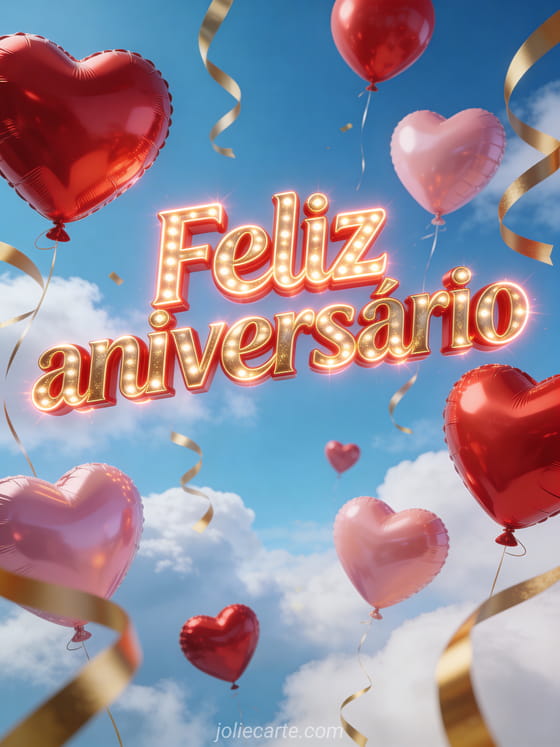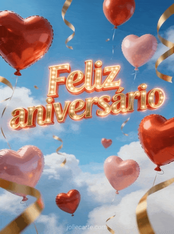 Envie este festivo cartão de aniversário gif animado com balões em forma de coração vermelhos e rosas, fitas douradas e um ambiente alegre. Descubra também o feliz aniversário gif animado para mulheres ou o feliz aniversário animado buquê de flores.
