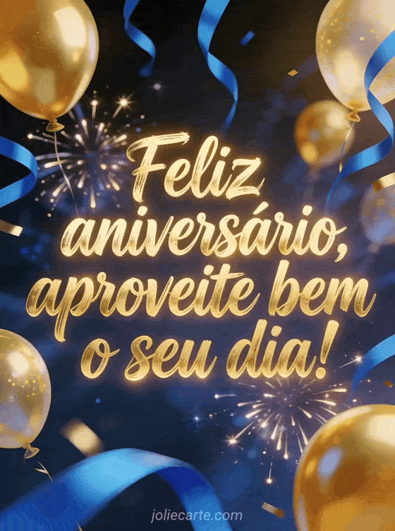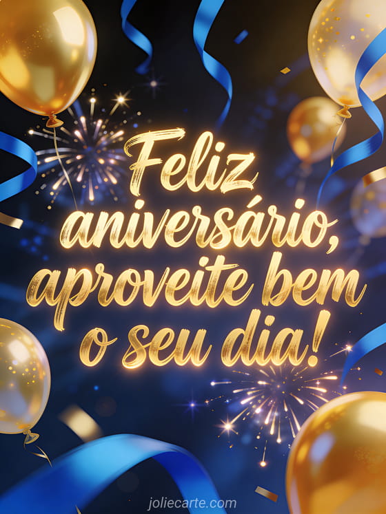 Deseje a ele um ótimo dia com um cartão de aniversário vibrante com letras douradas modernas, serpentinas azuis, balões dourados, explosões de luz e uma composição festiva dinâmica. Você também pode enviar um cartão de cartão de aniversário homem carro, um cartão de aniversário homem humor ou um cômico aniversário homem humor gif.